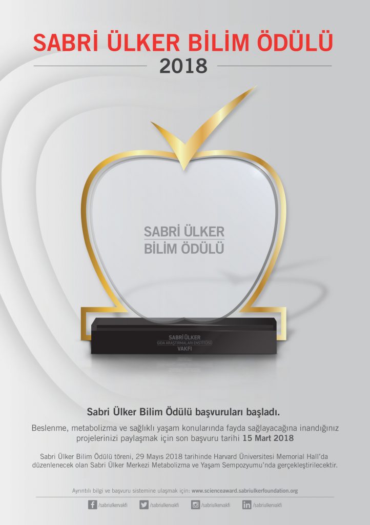 Son başvuru tarihi 15 Mart 2018 olan ve genç bilim insanlarını teşvik etme hedefiyle katılım üst yaş sınırının 45 olarak belirlendiği “Sabri Ülker Bilim Ödülü” yarışmasına, tamamlanmış orijinal projelerle sadece İngilizce başvuru yapılabiliyor. Uluslararası bilim insanlarının jürisi olduğu yarışmanın kazananı 29 Mayıs 2018 tarihinde Harvard Üniversitesi’nde düzenlenecek Metabolizma ve Yaşam Sempozyumu’nda gerçekleştirilecek ödül töreniyle açıklanacak. Kazanan bilimsel proje 100 bin TL ile ödüllendirilecek.