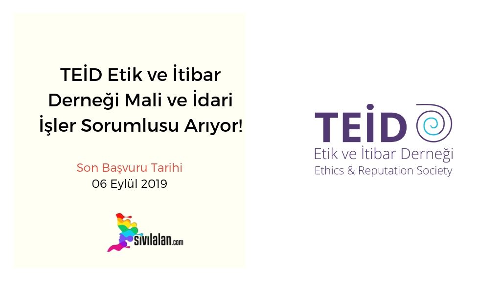 TEİD Etik ve İtibar Derneği, bünyesinde Mali ve İdari İşler departmanında görevlendirilmek üzere, benzer görevde en az 5 yıl iş deneyimi olan, Luca muhasebe programını iyi derecede kullanabilen, tek düzen hesap planına ve dernekler yönetmeliğine hakim, sivil toplum kuruluşu deneyimi olan ekip arkadaşı arıyor.