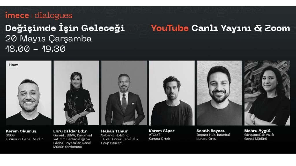 Moderatörlüğü’nü S360 Kurucusu ve Genel Müdürü Kerem Okumuş’un yapacağı “Değişimde İşin Geleceği” başlıklı webinar; Ebru Dildar Edin (Garanti BBVA Kurumsal Yatırım Bankacılığı ve Global Piyasalar genel Müdür Yardımcısı), Hakan Timur (Sabancı Holding IK ve Sürdürülebilirlik Grup Başkanı), Kerem Alper (ATÖLYE Kurucu Ortağı), Semih Boyacı (Impact Hub İstanbul Kurucu Ortağı) ve Mehru Aygül (Girişimcilik Vakfı Genel Müdürü) katılımıyla gerçekleştirilecek. Etkinliğe katılmak isteyenler Zoom (Kayıt Linki: https://us02web.zoom.us/meeting/register/tZEsdeGrrT8tG9csHUF7dTscu21nOEex9hTT) üzerinden kayıt yaptırabilecek. Ayrıca etkinlik imece kanalında, YouTube canlı yayını üzerinden de izlenebilecek.
