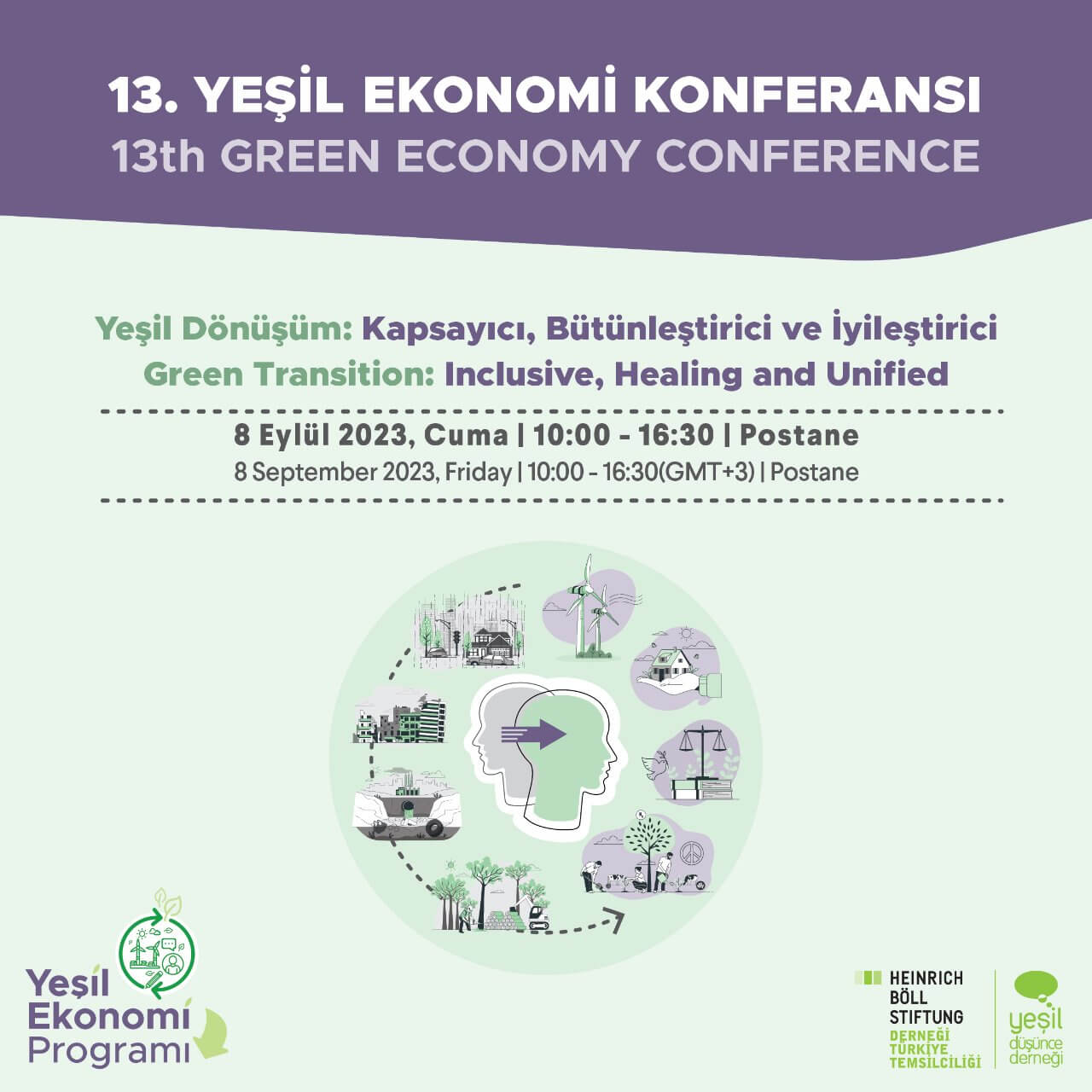 Sosyal adaleti ve eşitliği, tüm canlıların yaşam alanlarını ve hakkını gözeten, gezegenin eşiklerine saygı duyan bir anlayışla hareket eden yeşil ekonomi politikalarının bu dönüşümde önemli bir yeri olacağını vurgulamak isteyen Yeşil Düşünce Derneği, Heinrich Böll Stiftung Derneği Türkiye Temsilciliği ortaklığıyla düzenleyeceği 13. Yeşil Ekonomi Konferansı, “Yeşil Dönüşüm: Kapsayıcı, İyileştirici ve Bütünleştirici” başlığıyla 8 Eylül Cuma Günü, İstanbul Postane‘de fiziksel olarak gerçekleştirecek.