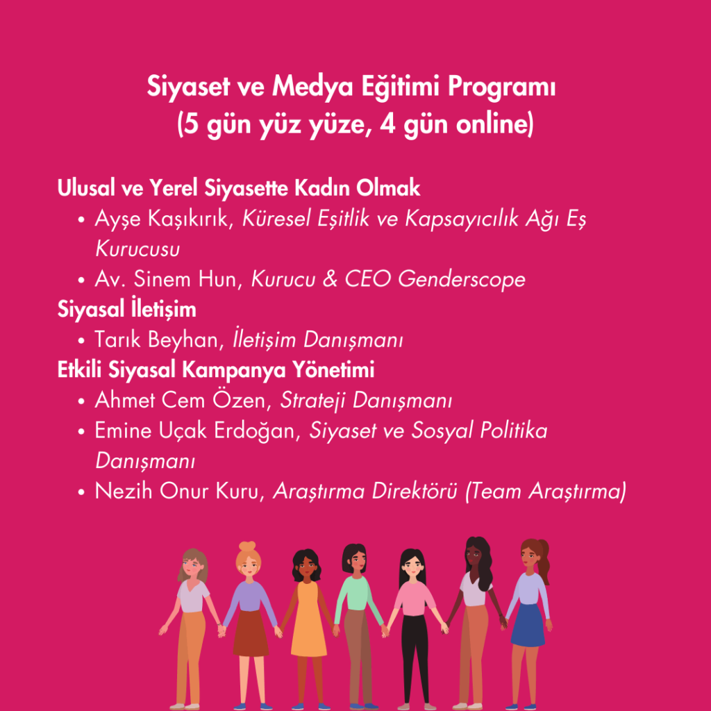 5 gün yüz yüze ve 4 gün online eğitimler olarak planlanan program Adaylık Süreci ve Etkili Kampanya Yönetimi; Seçim Mevzuatı; Siyasi İletişim Stratejileri; Medya Görünürlüğü ve Kampanyacılık; Sosyal Medya Yönetimi, Podcast ve Op-ed Teknikleri ana başlıkları odağında kapasite artırmayı hedefliyor. Program kapsamında Türkiye’nin dört bir yanından, 2024 Yerel Seçimlerinde göreve talip olmayı arzulayan 114 kadın adayı ağırlayacağız. Eğitim kapsamında katılımcılara haber spikerleri ile gerçekleşecek uygulamalı oturumlar ile pratik yapma ve eğitimlerin ardından düzenlenecek ağ oluşturma etkinliğinde medya profesyonelleri ve gazetecilerle tanışarak etki alanlarını artırma fırsatı sunacağız.