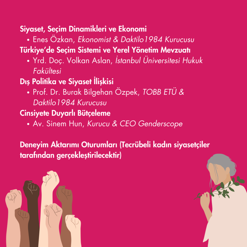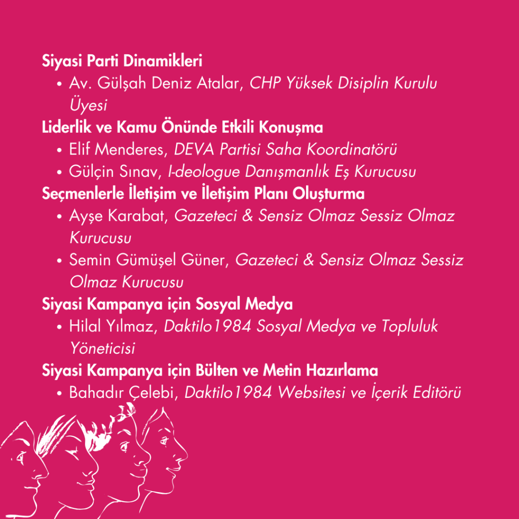 2024 yerel seçimlerinde aday olmaya karar vermiş veya aday olmayı düşünüyor ancak henüz karar vermemiş, siyasi liderlik ve medya görünürlüğü alanlarında kendilerini geliştirmek isteyen her yaşta kadın programa başvurabilir.