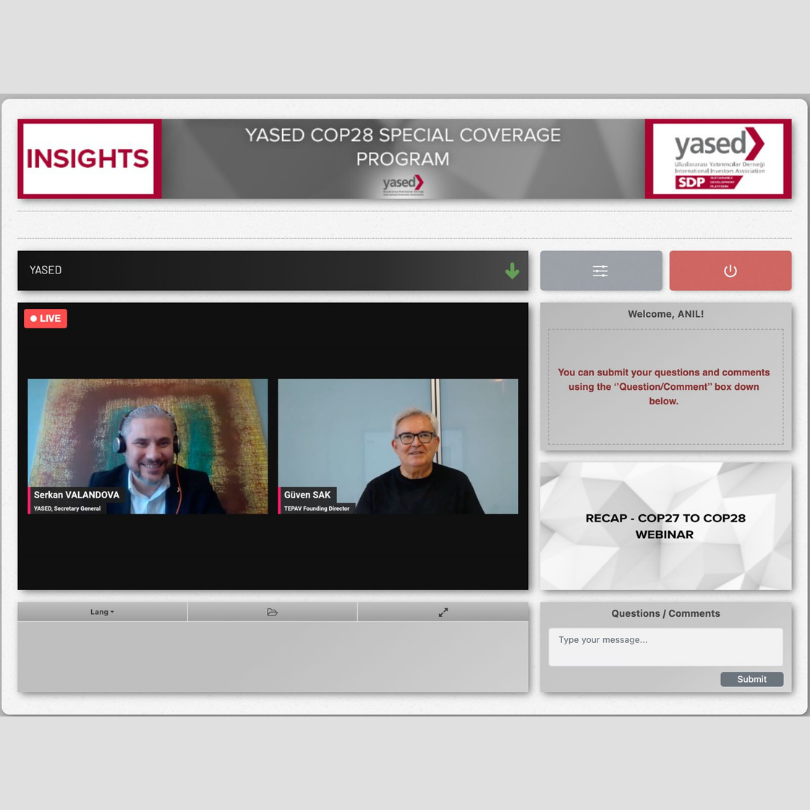 Uluslararası Yatırımcılar Derneği (YASED) tarafından hazırlanan COP27’den COP28’e Webinar yayınının ilkinde, YASED Genel Sekreteri Serkan Valandova ve Türkiye Ekonomi Politikaları Araştırma Vakfı (TEPAV) Kurucu Direktörü Güven Sak, COP27’deki ilerlemeler ve kazanımlar ile COP28’e giden yolda beklenen taahhütler hakkındaki değerlendirmelerini dinleyicilerle paylaştı.