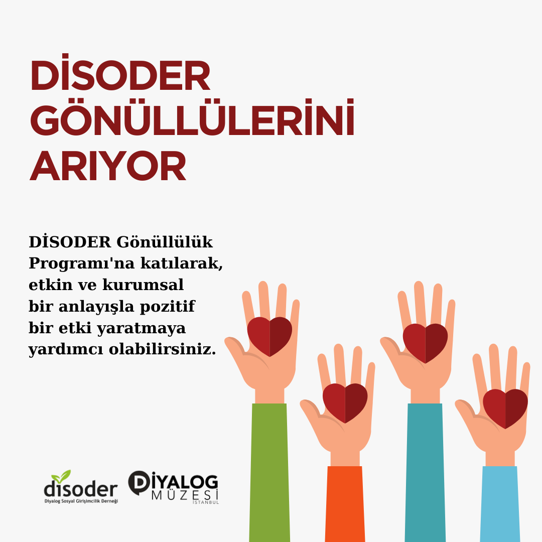 Diyalog Sosyal Girişimcilik Derneği (DİSODER) olarak, topluma katkı sağlamak isteyen genç gönüllüleri arıyoruz! Misyon ve vizyonumuz doğrultusunda etkin ve kurumsal bir anlayışla çalışmak isteyen 18-30 yaş arası gençleri gönüllülük programımıza davet ediyoruz.