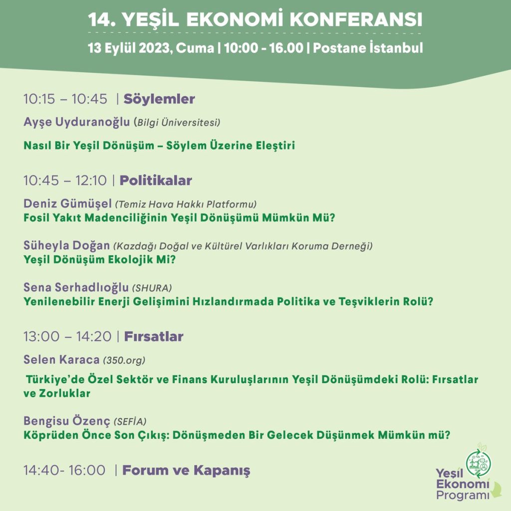 Yeşil Düşünce Derneği ve Heinrich Böll Stiftung Derneği Türkiye Temsilciliği olarak 13 Eylül Cuma günü Postane’de düzenleyeceğimiz 14. Yeşil Ekonomi Konferansı’nda bu sorulara yanıt arayacağız.