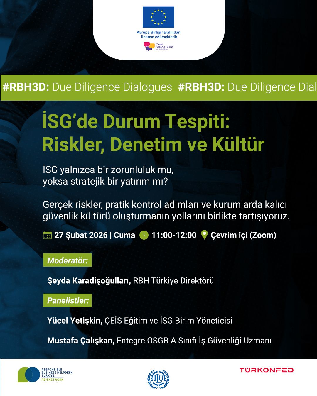 İşletmelerin insan hakları ve çevresel durum tespiti (HREDD) kapasitelerini güçlendirmeyi; çalışan haklarının korunmasını ve insana yakışır iş uygulamalarının yaygınlaştırılmasını hedefleyen proje kapsamında düzenlenecek “İSG’de Durum Tespiti: Riskler, Denetim ve Kültür” webinarına tüm paydaşlar davetlidir.