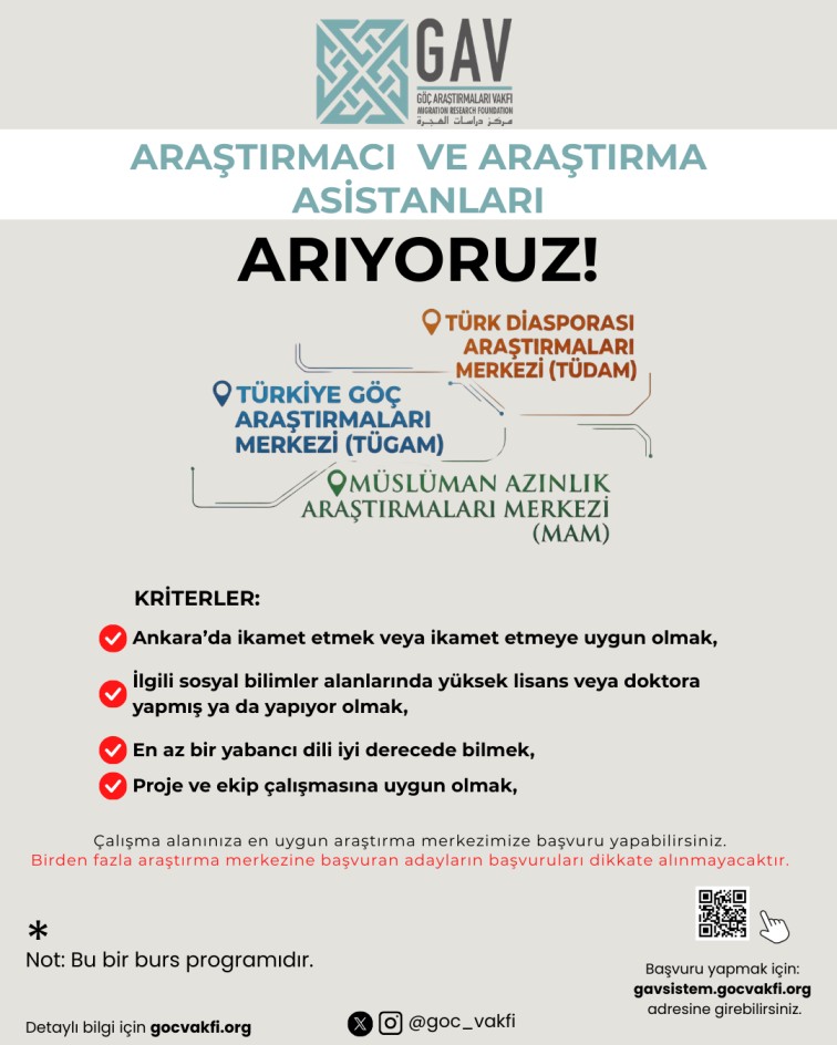 Bu kapsamda Göç Araştırmaları Vakfı, bünyesinde faaliyet gösteren araştırma merkezlerinde görev almak üzere araştırmacı ve araştırma asistanı aramaktadır.